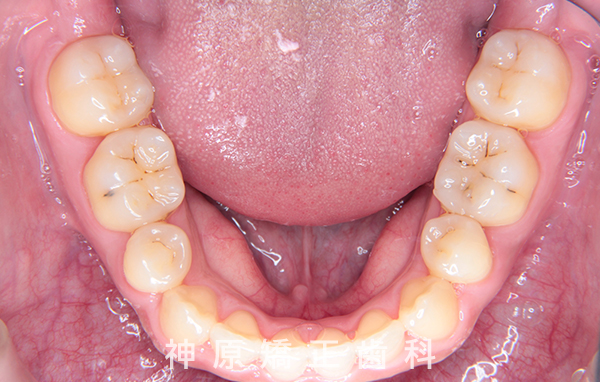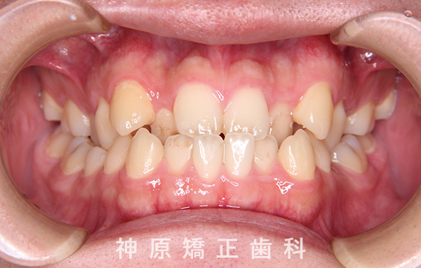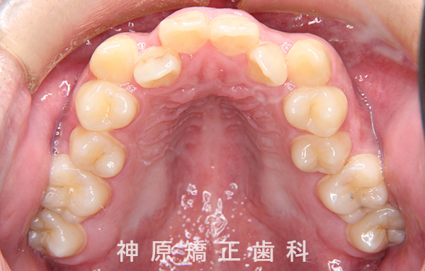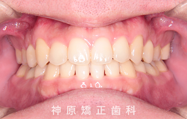 精密検査の結果、大きな骨格的なずれはありませんでした。しかし、あごと歯の大きさのバランスが悪く、すべての歯を並べると横顔の見た目が悪化する可能性がありました。また、適切な歯軸の獲得も難しい状況でした。そのため、小臼歯を抜歯して適切なスペースを確保し、歯並びを整えることにしました。これにより、ガタガタした歯並びや前歯の噛み合わせの問題が改善されました。